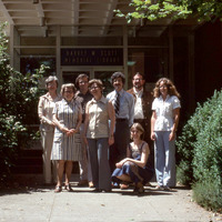 A group portrait of the staff of Pacific University's Scott Memorial Library in July, 1978. They are standing just outside the entrance to the library. Librarians and/or support staff pictured here include: Mary Ann Mellbye (tentatively identified, back row, farthest left); Alex Toth (back row, second from left); Charles Kemp (back row, farthest right); Alice Wilson (tentatively identified, front row, farthest left); and Helen Dugdale (tentatively identified, front row center). This is one of a set of photographs that appears to have been posed in order to demonstrate the range of work that was taking place in the library.