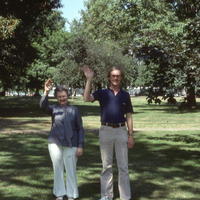 - Two people, presumably staff members of Pacific University, waving while standing on a lawn. The area resembles the northern area of campus by the Lincoln Park Athletic Complex, but may be in another location. The original slide was printed in August, 1978.