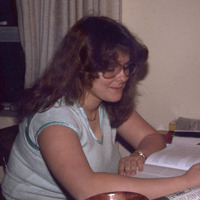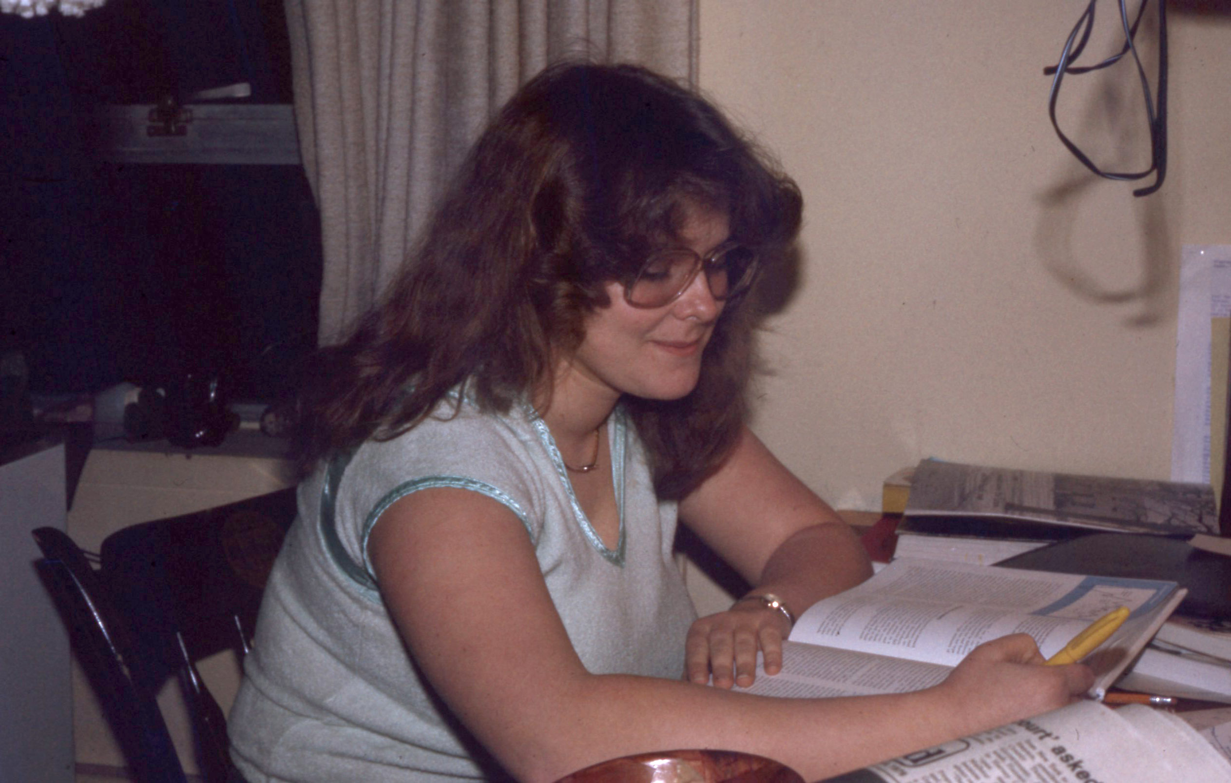 - A woman, probably a Pacific University student, studying with books, notes and a highlighter. She appears to be in Pacific dormitory: possibly Walter Hall. The original slide was printed in March, 1979.