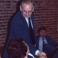 - Pacific University President James Miller shaking hands with a woman, while attending a Pacific University Board of Trustees meeting on the third floor of Marsh Hall. This is one of a set of photographs that were all taken during the same meeting. The original slide was printed in March, 1979.