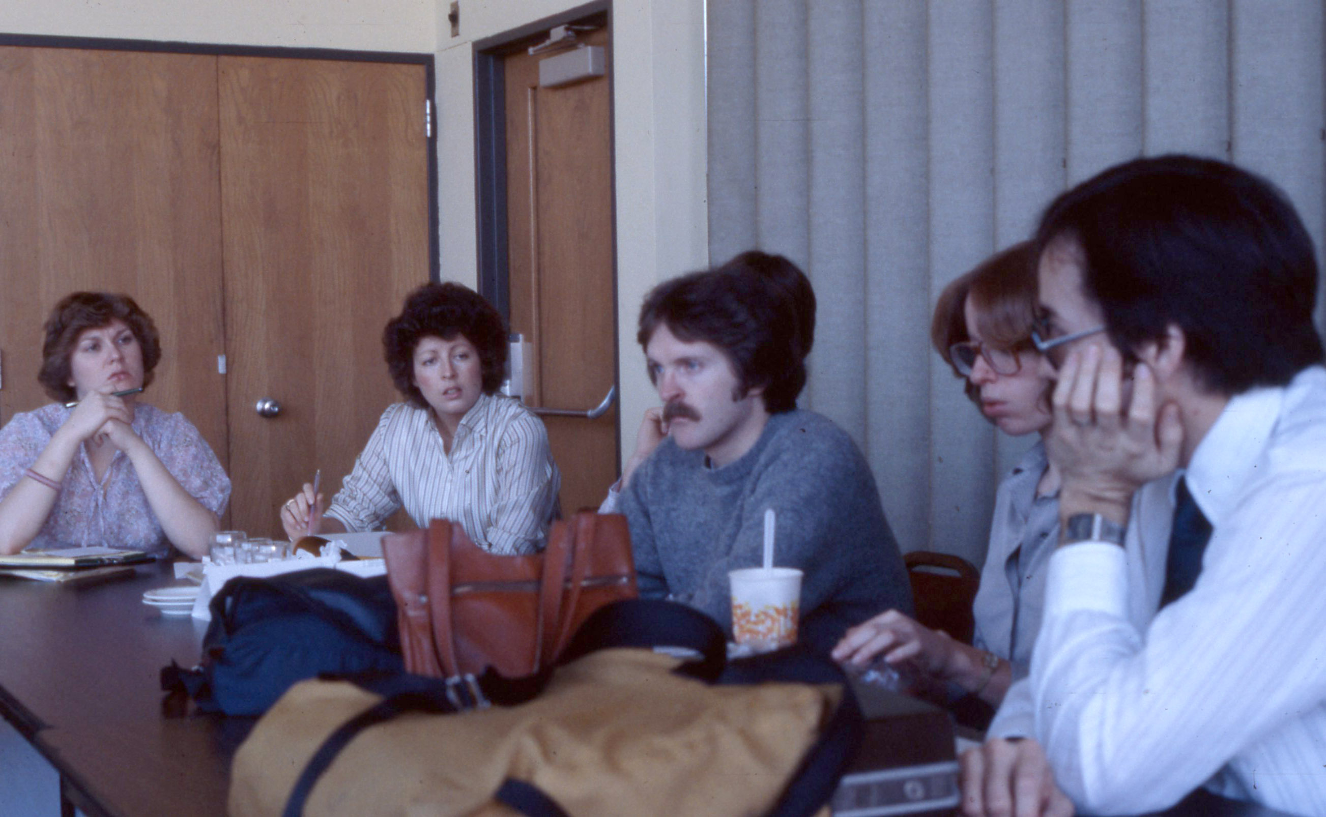 - Pacific University students and/or staff at a meeting held in Washburne Hall in March 1979. At that time, the university was in the midst of reforming its governance system; this meeting may have been held to discuss the issue (see The Index, Mar. 16, 1979). This is one of a set of several photographs taken at the same meeting.