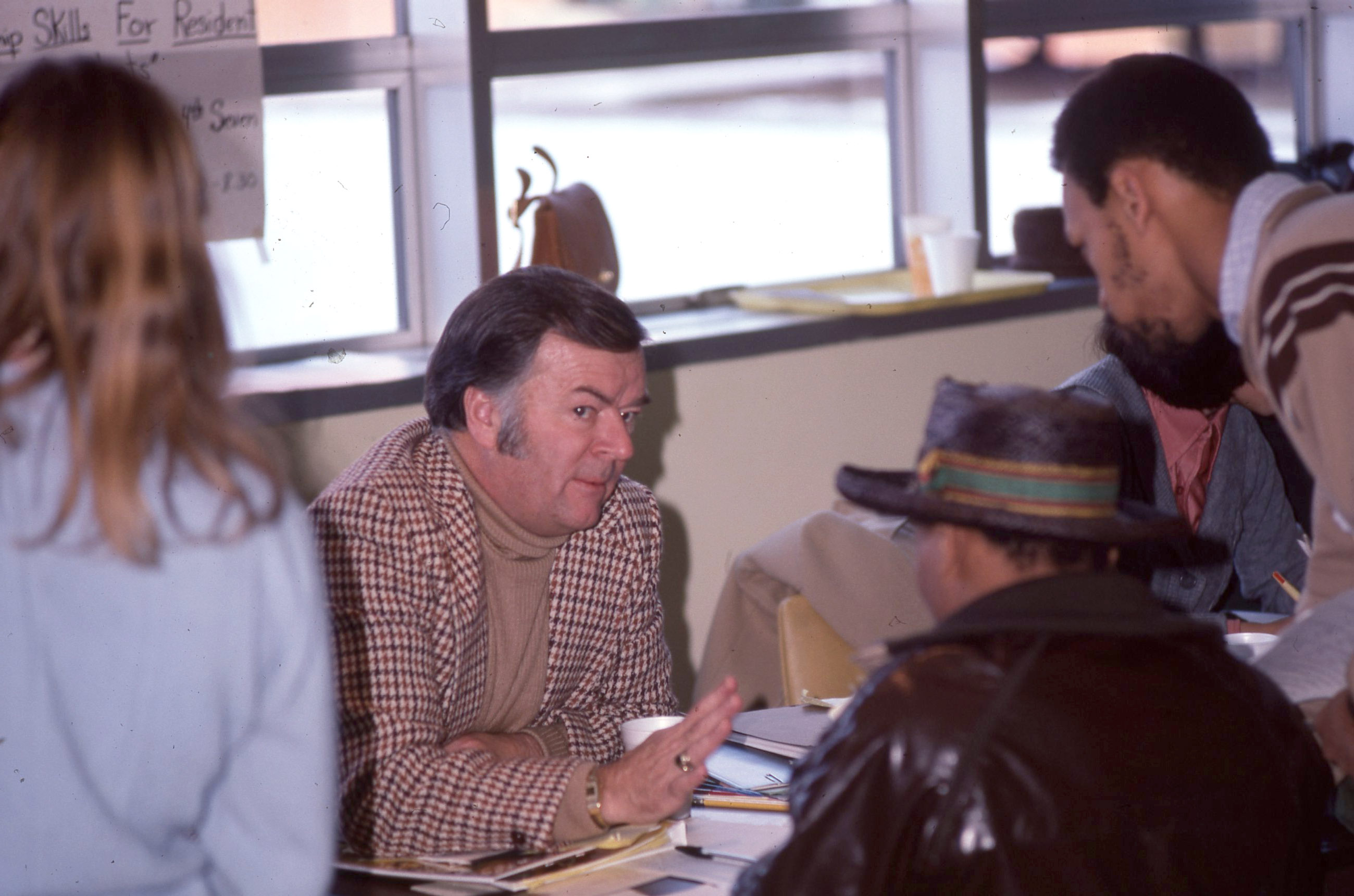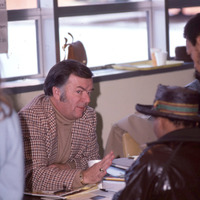 A man, probably Professor Ward Schwarzman who taught Education, sitting at a table in Pacific University's Washburne Hall. Several students are clustered in front of him, apparently conversing with him. Based on other images from the same event, this may have been a course registration event held in January, 1979. The slide was printed in March, 1979.