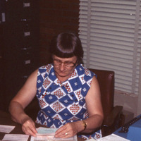 - A woman, probably library staff, at Pacific University. She appears to be performing clerical work, with index cards in front of her and a typewriter on the side. Other boxes and office equipment are in the background. The original slide was printed in July, 1979.