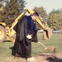 - A man in academic robes wielding a golden shovel, participating in the groundbreaking of Pacific's Murdock Hall in early October, 1979. The event was described in the student newspaper as a "ground-breaking ceremony for the $1.5 million chemistry wing of Pacific's new science facility" (The Index, Oct. 12, 1979).