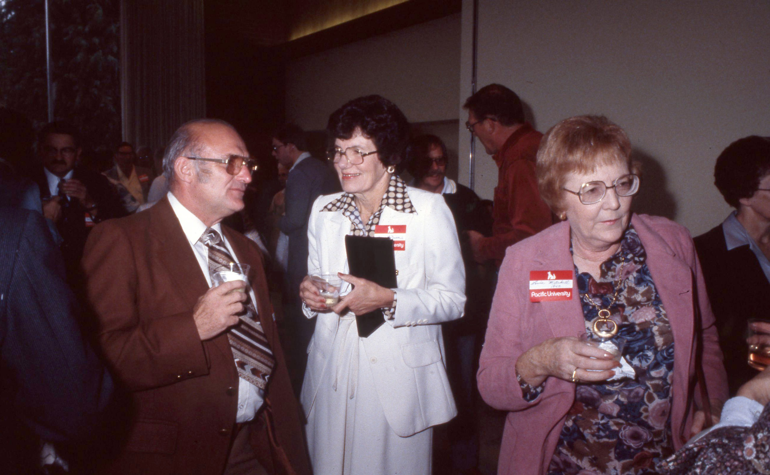 Pacific University alumni gathered at a reception, likely in Washburne Hall. The woman wearing a pink jacket is Louise Mitchell (Class of 1942), per her name tag. The name tag of the woman wearing white is only partially visible, but may be "McDowell". This was likely taken at the annual Alumni Reunion that took place on Homecoming weekend. The original slide was printed in October, 1979.