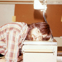 - A man, probably a member of Pacific University's AV (audio-visual) department, hamming it up for the camera by laying his head onto the glass of an overhead projector. The original slide was printed in October, 1979. For two other images taken at the same time, see: PUA_PeoSlides_380 and PUA_PeoSlides_382.