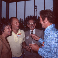 Attendees at a reception for Pacific University alumni in October 1979, probably held during Homecoming weekend. The man in pale yellow is Douglas Stewart (Class of 1961). The man with the tie is Pacific's President, James Miller. The man in blue has a name tag that reads "French," but his first name is not visible. The photograph was likely taken in Washburne Hall. The original slide has a handwritten note: "By Elwyn Williams." Williams apparently took the photo, but he was also in the ceremony: he was the Vice President of University Relations and per the newspaper, took part in the event.