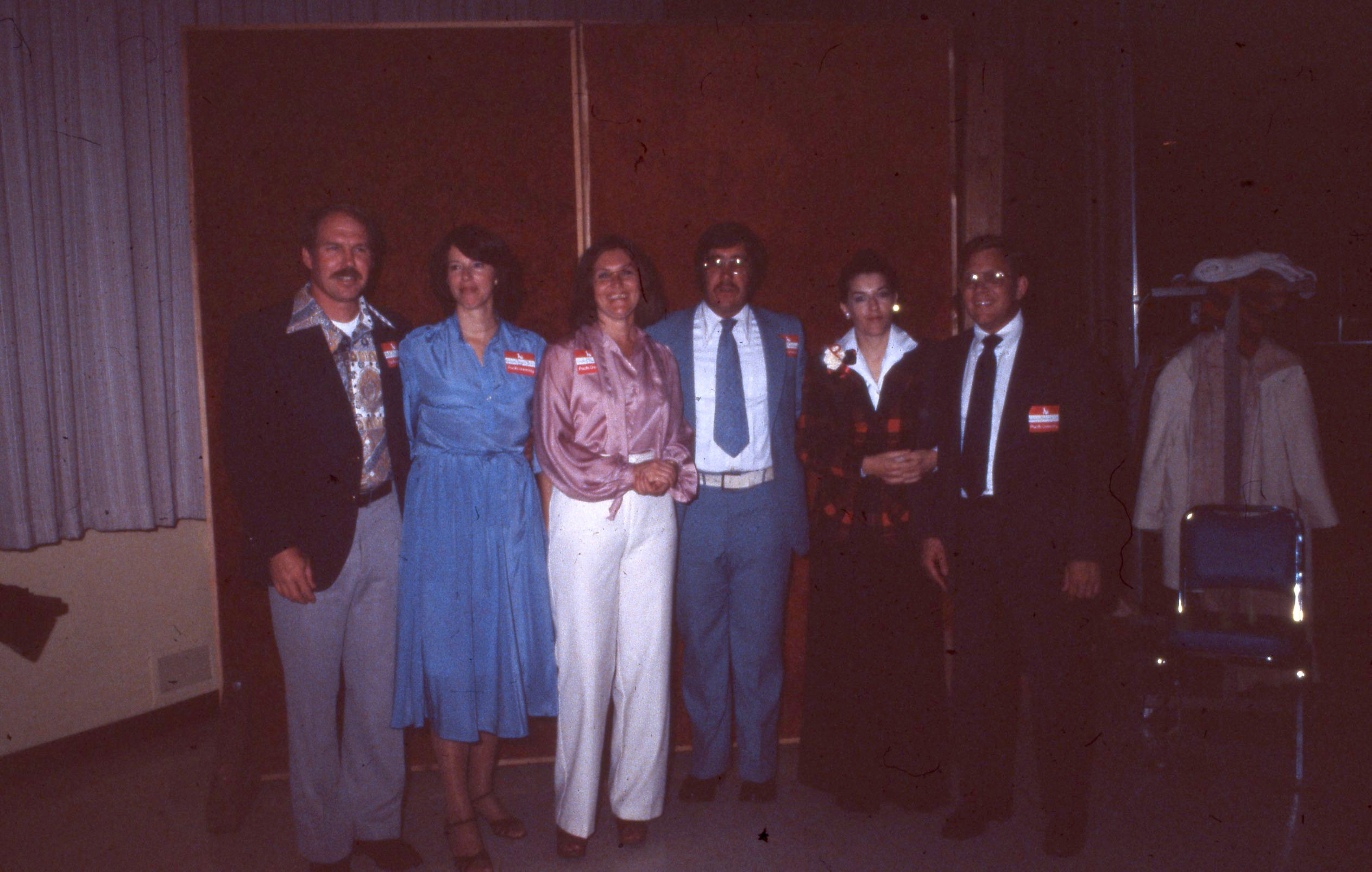 - A group of Pacific University alumni at a reception in October 1979. The original image was dark, and their name tags are not legible.