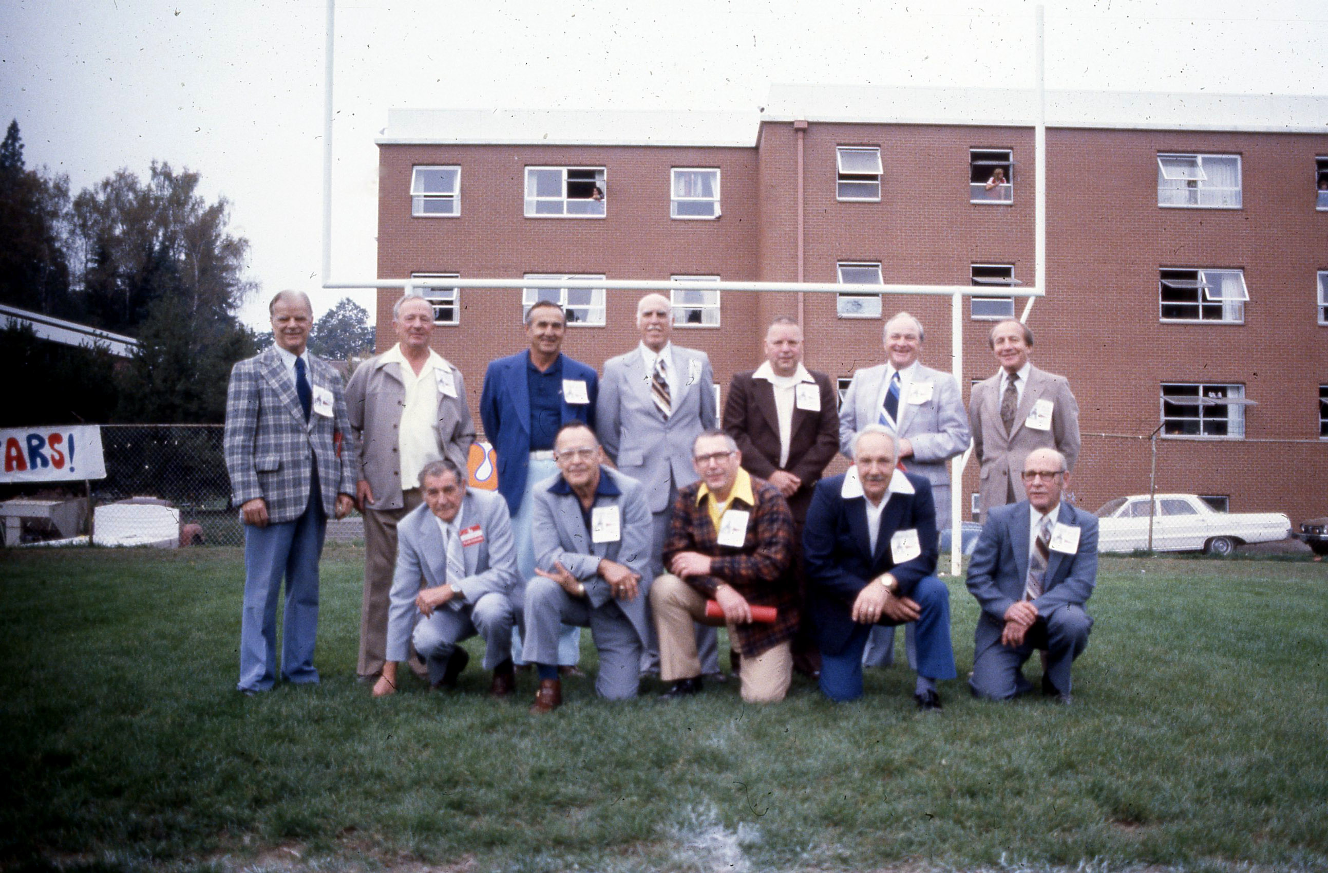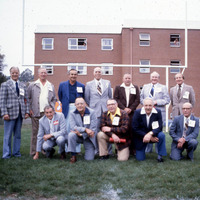 A group of Pacific University alumni in October 1979, standing near Clark Hall. All of the men are older and most are wearing special, oversized name tags. They were likely attending the annual Reunion which took place on Homecoming weekend. They are standing on the west side of what was then the football field; they may have been former Pacific football team members. Alternatively, they may have been members of the Class of 1929, who would have celebrated their 50th Reunion that year.