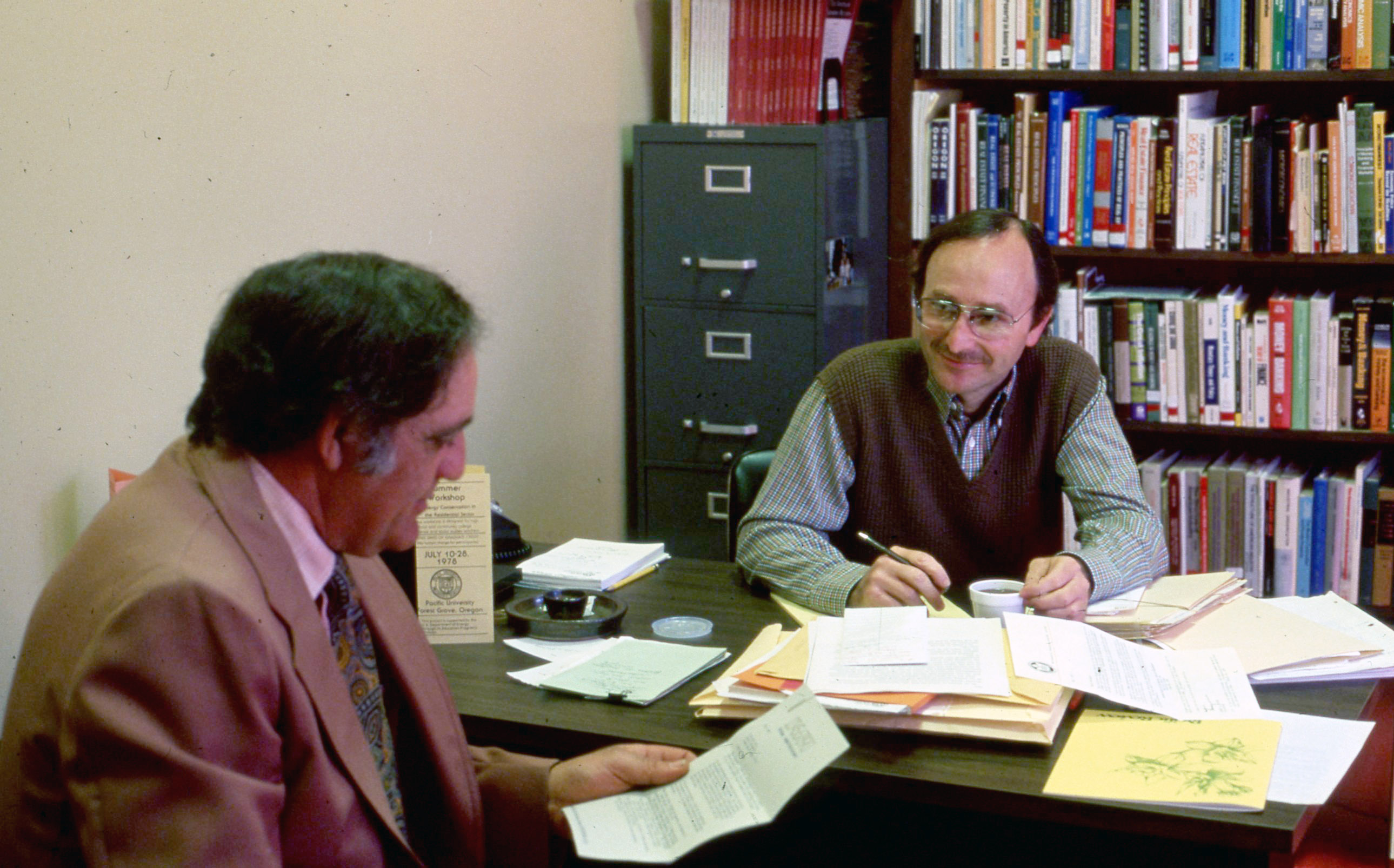 Professor Joe Story, who taught Economics at a Pacific University, in his office with a visitor who may have been another professor or an administrator. They appear to be discussing a letter that the visitor is holding in this hand. Books on economics and business topics are on the shelves in the background. This photograph was likely taken between 1977 and 1983.
