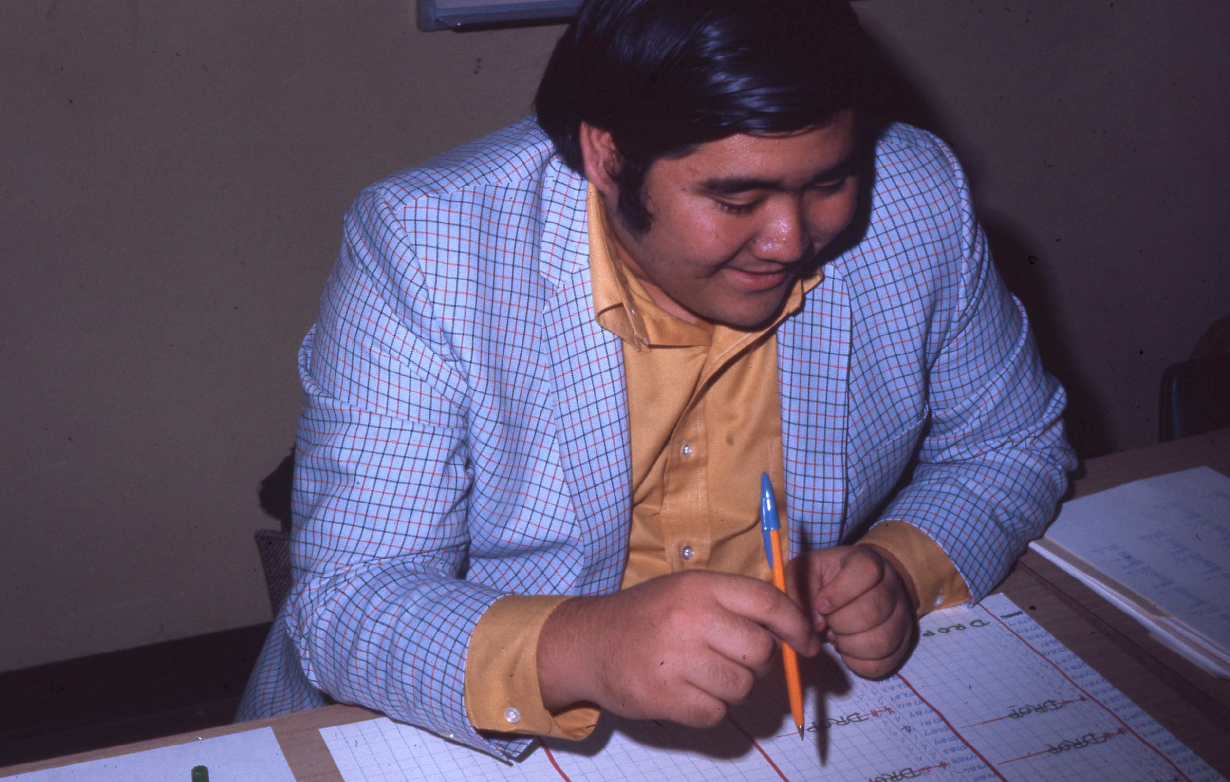Harlan Takahashi, who was probably a student or faculty member at Pacific University, with what appears to be a chart with data: possibly an attendance sheet. Based on another photograph that appears to have been taken at the same time, he was likely working with a class led by Speech and Communications professor Albert "Hap" Hingston. This photograph was probably taken circa 1970-1973.