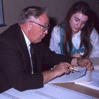 - Pacific University professor Albert "Hap" Hingston with student Val King (Class of 1973). Hingston taught speech and communications. They appear to be examining data collected on the papers that are spread out on the desk in front of them. This photograph was probably taken circa 1970-1973.
