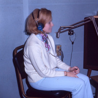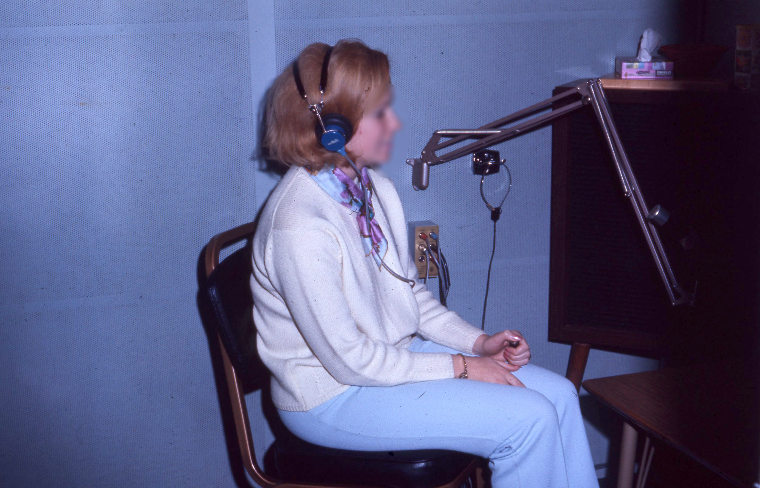 A woman, possibly a Pacific University student, participating in a speech experiment or therapeutic intervention. She is seated by a microphone, which based on a related image, was connected to a recording device that was being operated by Professor Arthur Wilcox. Her face has been blurred and her name (which is written on the original slide) has been omitted to protect her privacy. This is one of a small set of photographs which appear to show research on speech and/or speech interventions, overseen by Pacific University speech and communications Professor Arthur Wilcox. See images PUA_PeoSlides_409 through PUA_PeoSlides_413. These photographs were likely taken circa 1970-1971.