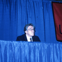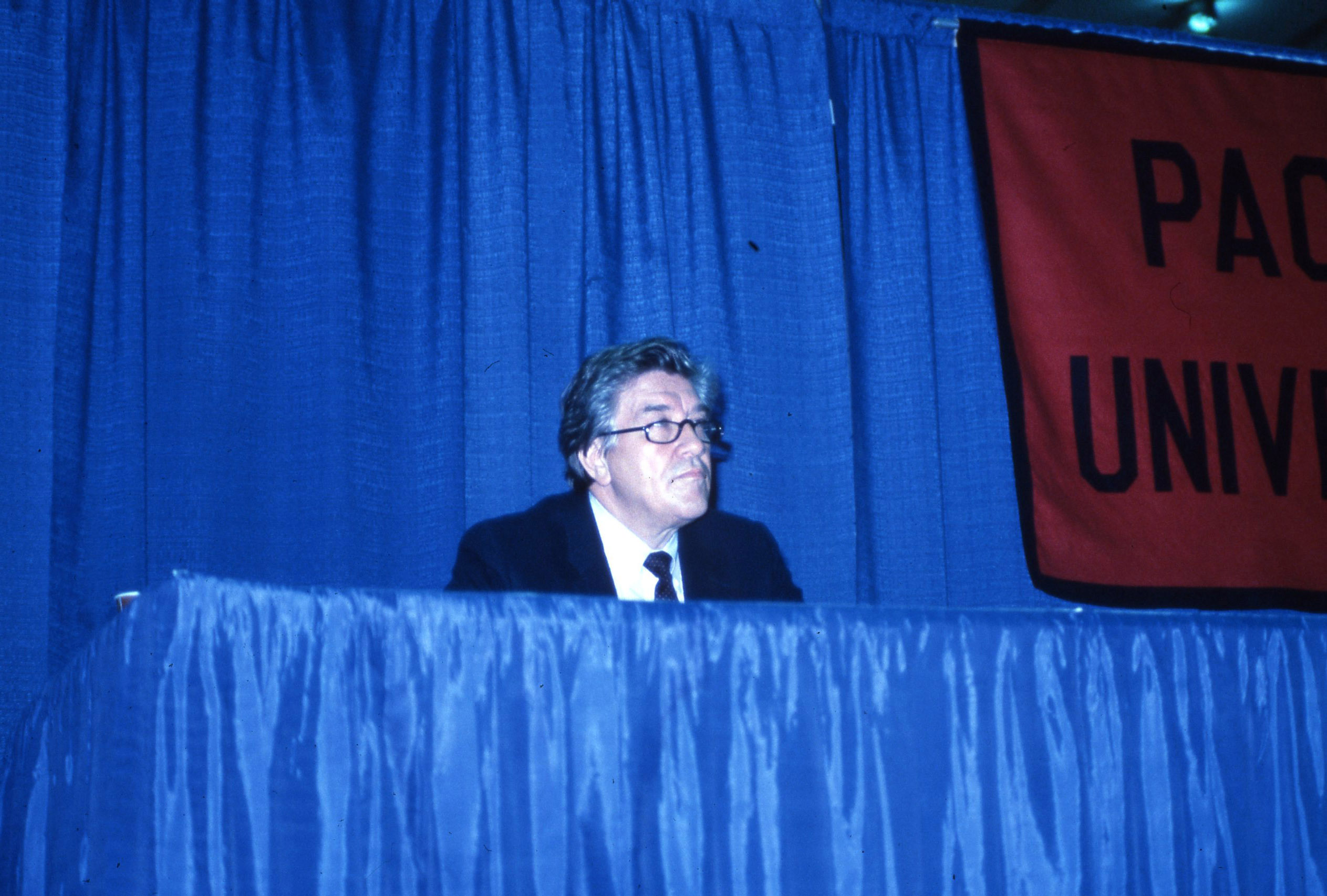 Former Senator Dick Clark, D-Iowa, preparing to speak at Pacific University's Tom McCall Forum on March 29, 1984. Clark was preparing to debate conservative commentator William F. Buckley on the topic: “America’s Future: Is Liberal Politics Dead?”