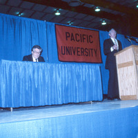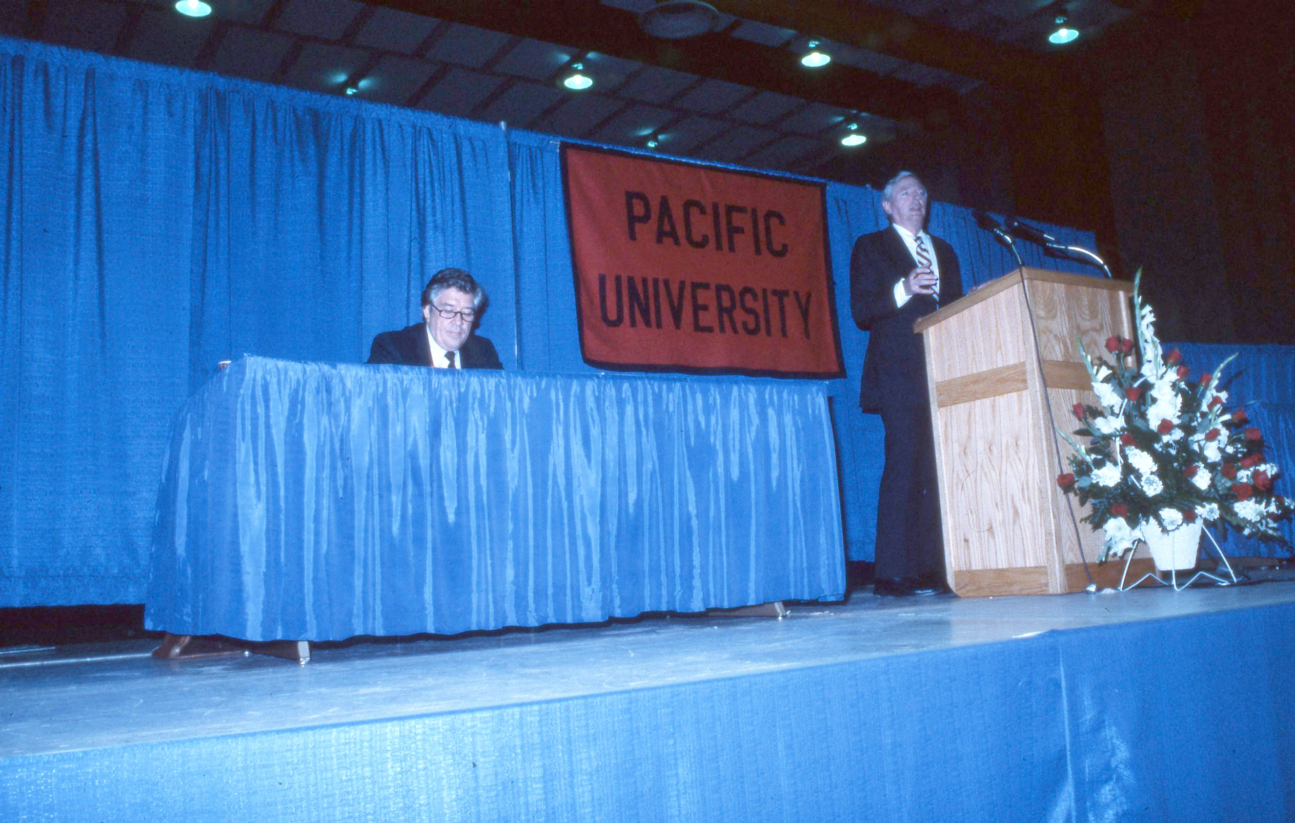 Former Senator Dick Clark, D-Iowa (left) and conservative commentator William F. Buckley (right), speaking at Pacific University's Tom McCall Forum on March 29, 1984. The two men were debating the topic: “America’s Future: Is Liberal Politics Dead?”