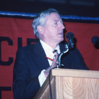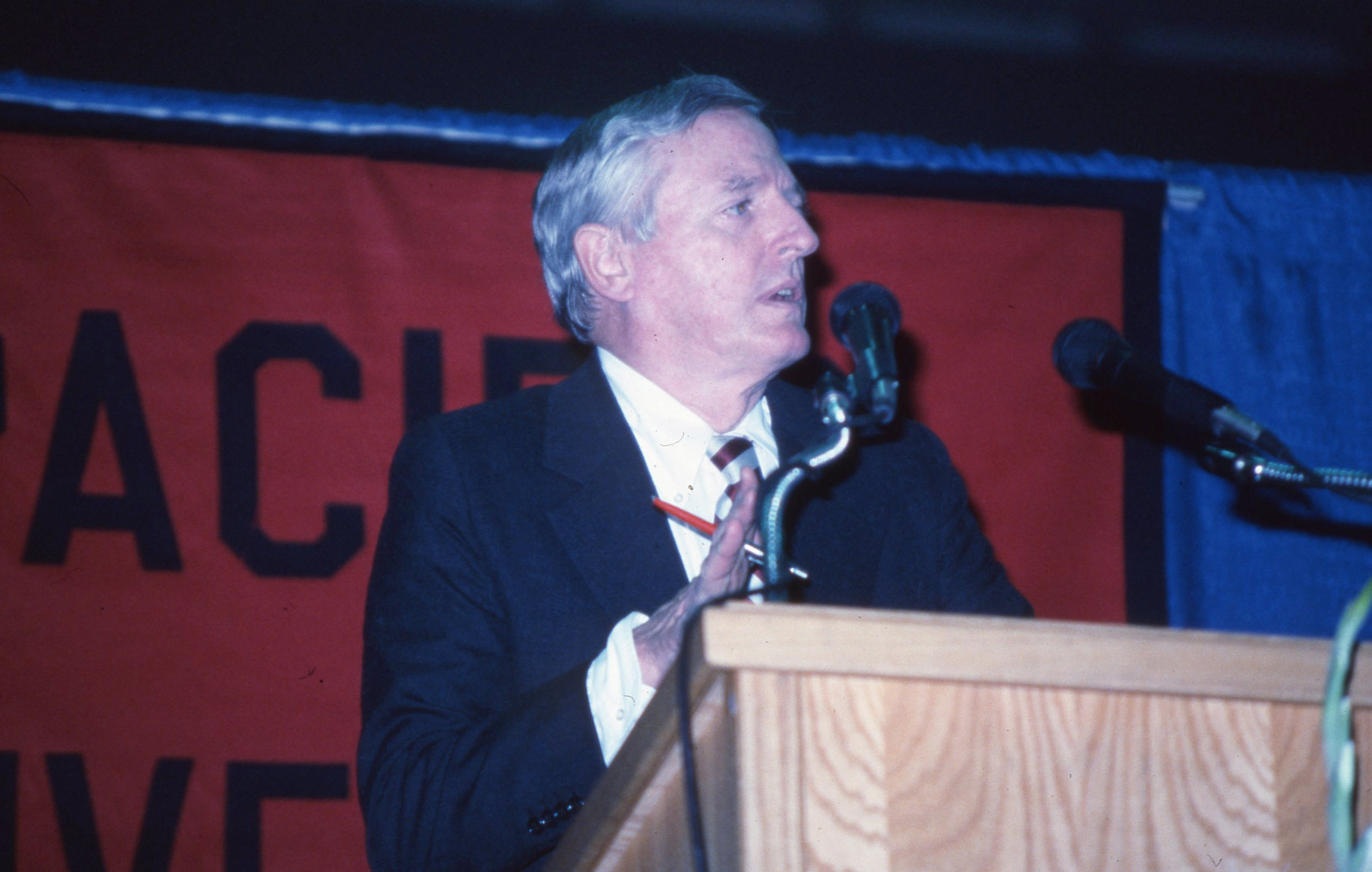 Conservative commentator William F. Buckley, speaking at Pacific University's Tom McCall Forum on March 29, 1984. Buckley was debating former Senator Dick Clark (D-Iowa) on the topic: “America’s Future: Is Liberal Politics Dead?”