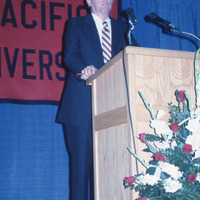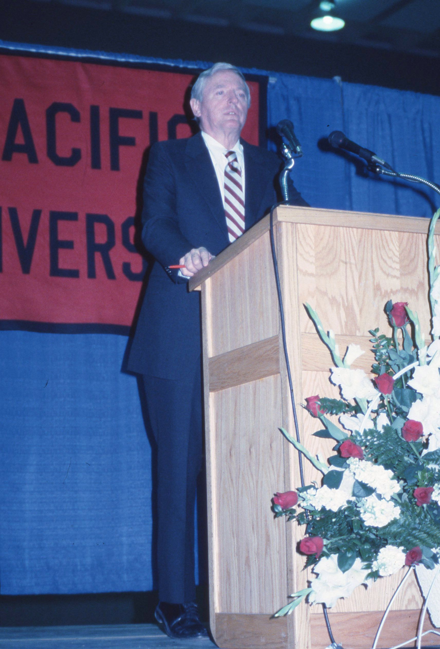 Conservative commentator William F. Buckley, speaking at Pacific University's Tom McCall Forum on March 29, 1984. Buckley was debating former Senator Dick Clark (D-Iowa) on the topic: “America’s Future: Is Liberal Politics Dead?”