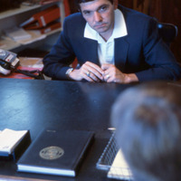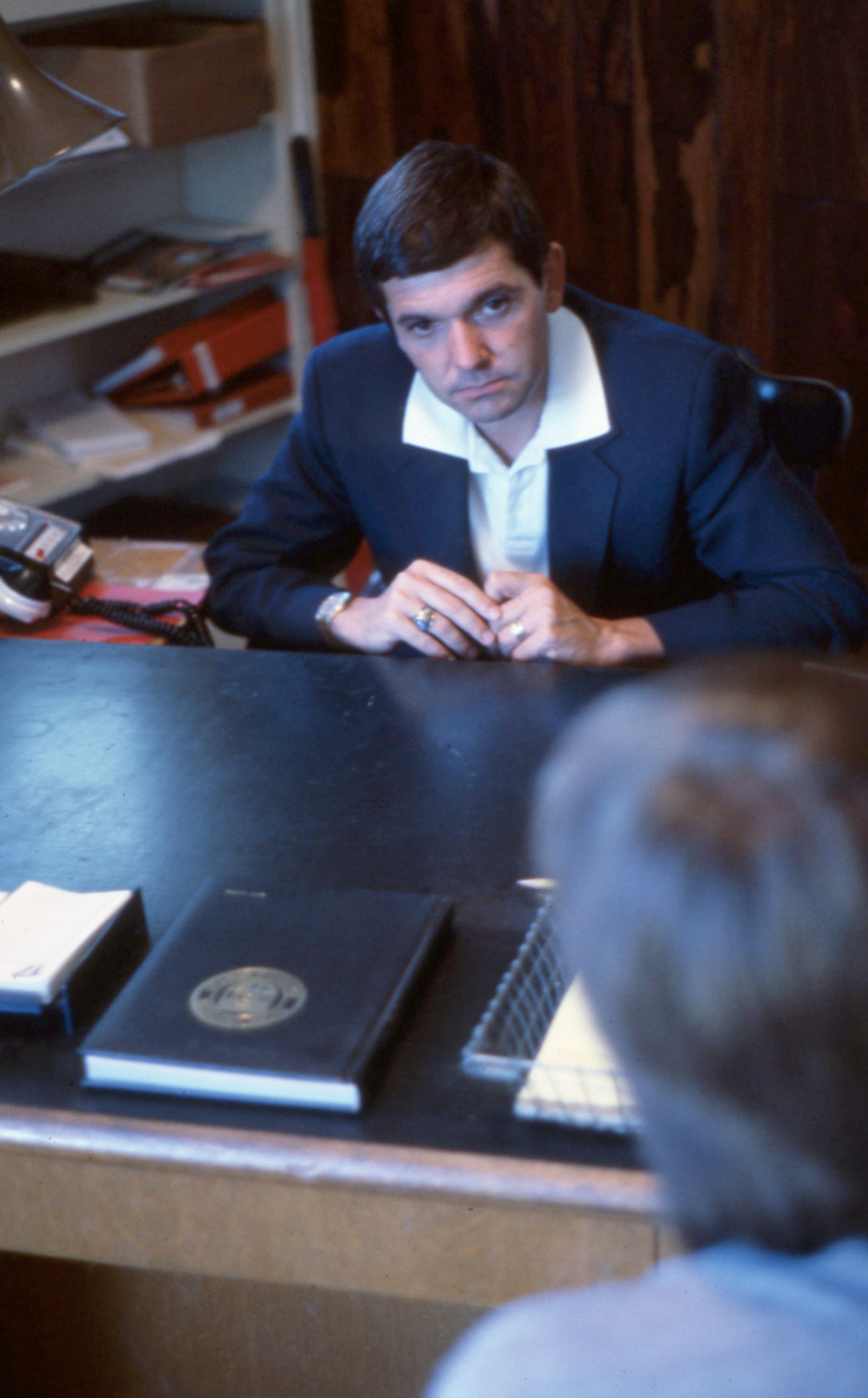 - A man, possibly a Pacific University professor or administrator, speaking at his desk with a visitor. The bound volume in the foreground appears to have the Pacific University seal printed on it. This photograph is undated; it may have been taken in the early 1980s. For a related image, see: PUA_PeoSlides_436