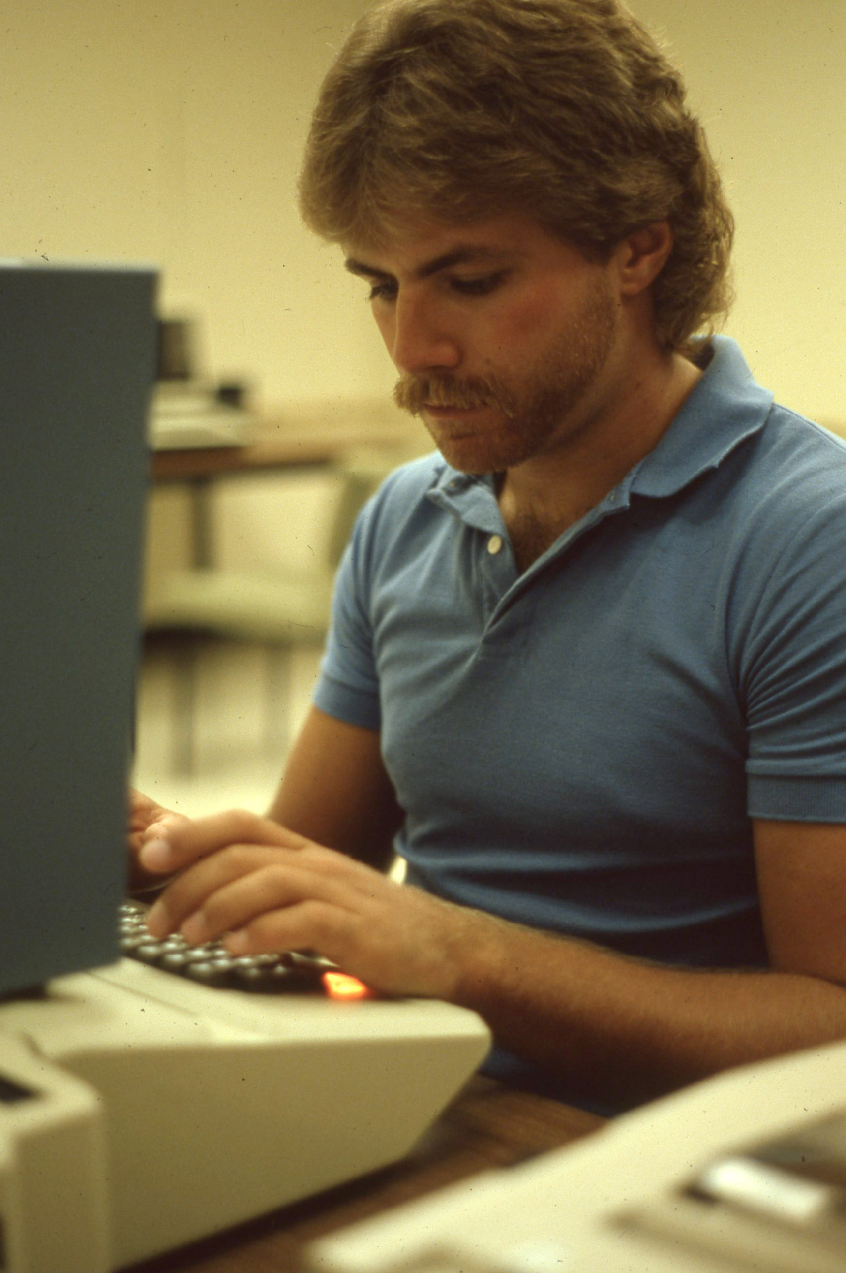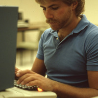 - A man, probably a Pacific University student, using a personal computer in a campus computer lab. This photograph appears to be posed, and was likely taken by a staff photographer to illustrate a Pacific publication. It likely dates from circa 1982-1985.