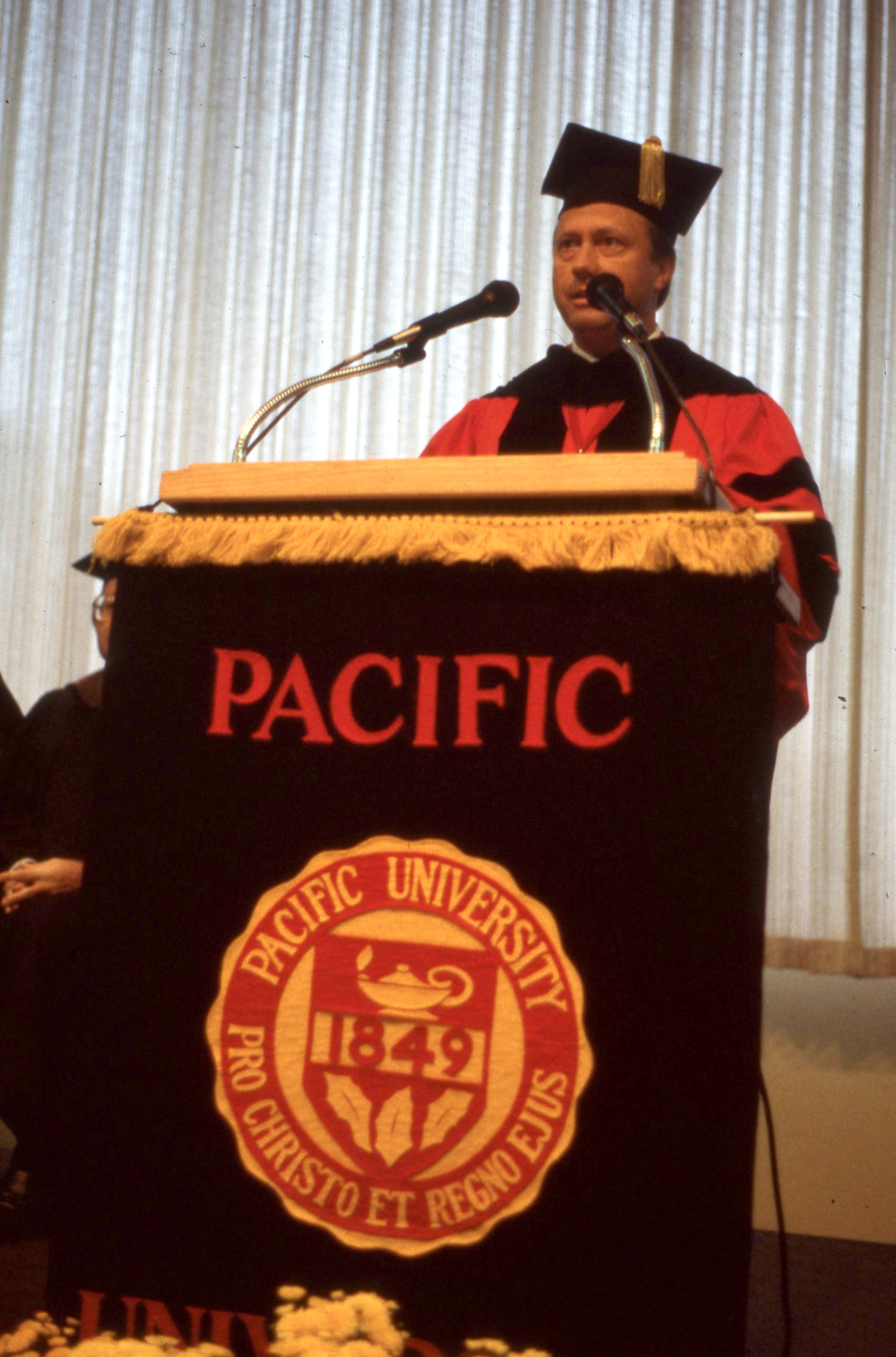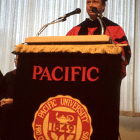 Pacific University's President Robert F. Duvall, speaking at a podium while wearing academic regalia. This photograph appears to have been taken in Washburne Hall. As academic robes are only worn on special occasions such as Commencement (which was normally held elsewhere), it is possible that this photograph is from Duvall's inauguration in 1983; or it may be from a later time.