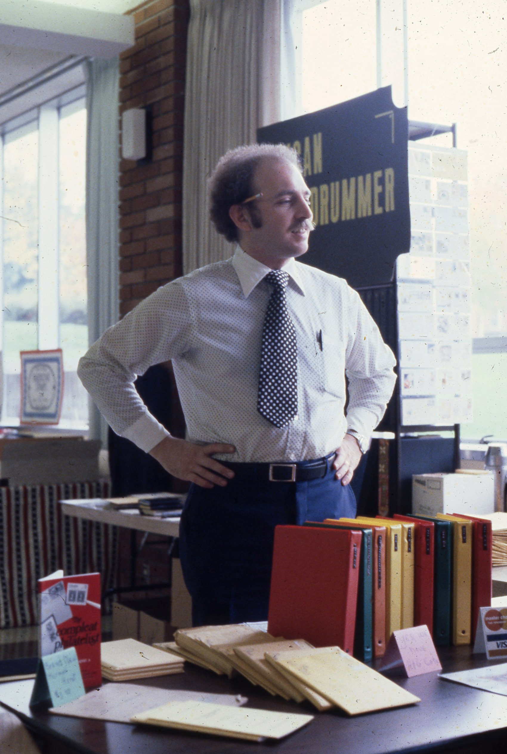 A, probably a Pacific University staff member, hosting a table in Washburne Hall. Based on the signage, decor and related photographs, he appears to be promoting campus mail services and/or selling postage stamps and mailing supplies. There is a stamp-collecting book on the table, titled: The Compleat Philatelist. This photograph was likely taken circa 1978-1985. For related images, see: PUA_PeoSlides_444 and PUA_PeoSlides_446.