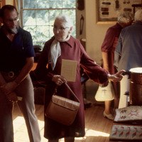 Mildred Scobee Reeher (Pacific University Class of 1919) visiting a display in the Pacific University Museum, located in Old College Hall. This photograph was probably taken during Pacific's annual Reunion in October 1981, shortly after Old College Hall had gone through an historic restoration. The Alumni Magazine featured a photograph of Reeher on the cover of their Fall 1981 issue, noting that she was the "oldest alumna present" in that year, having graduated 62 years earlier. In this image, she is standing near several Umatilla cornhusk bags (lower right) and is touching what appears to be a copper pot. The man on the left is Professor Robert Davies, who taught English.