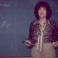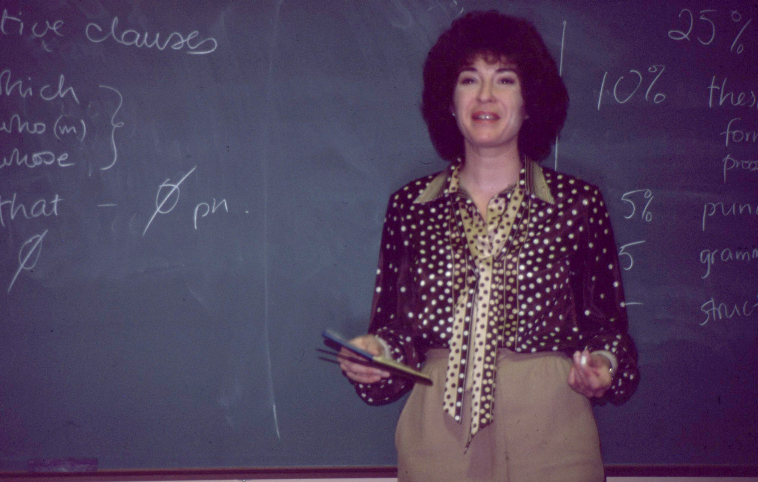 A Pacific University professor, possibly Varina French, teaching a class. A blackboard with grammatical rules written on it is behind her. Though unconfirmed, she resembles Varina French, a Pacific University alumna (Class of 1956 and MS 1965), who worked in the Physical Education department, coached gymnastics, and founded the university's Physical Therapy program. The original slide was printed in May, 1980.