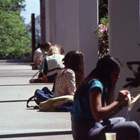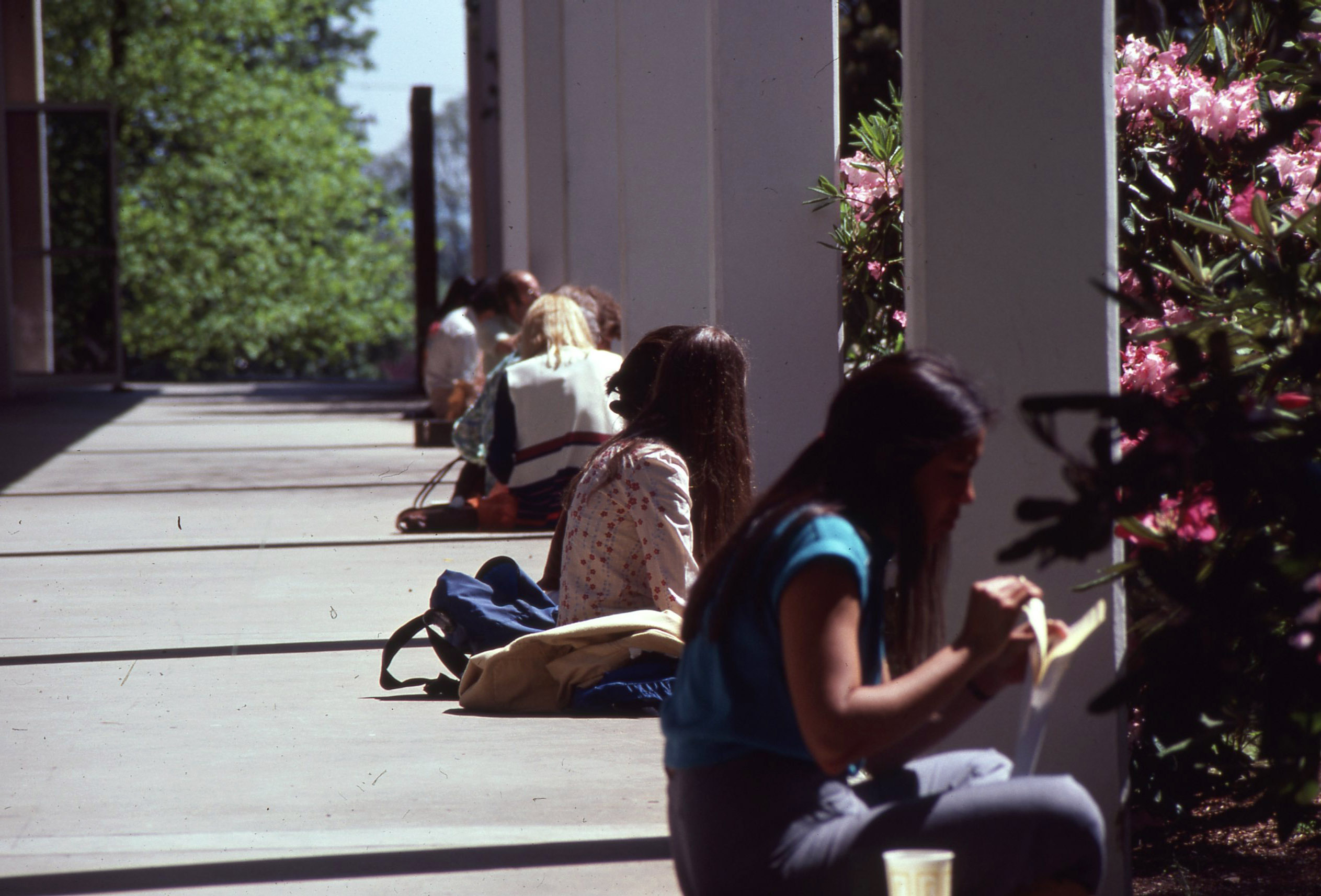 - Pacific University students sitting in the sun on the patio of Washburne Hall. This was likely taken by a staff photographer. The original slide was printed in May, 1980.