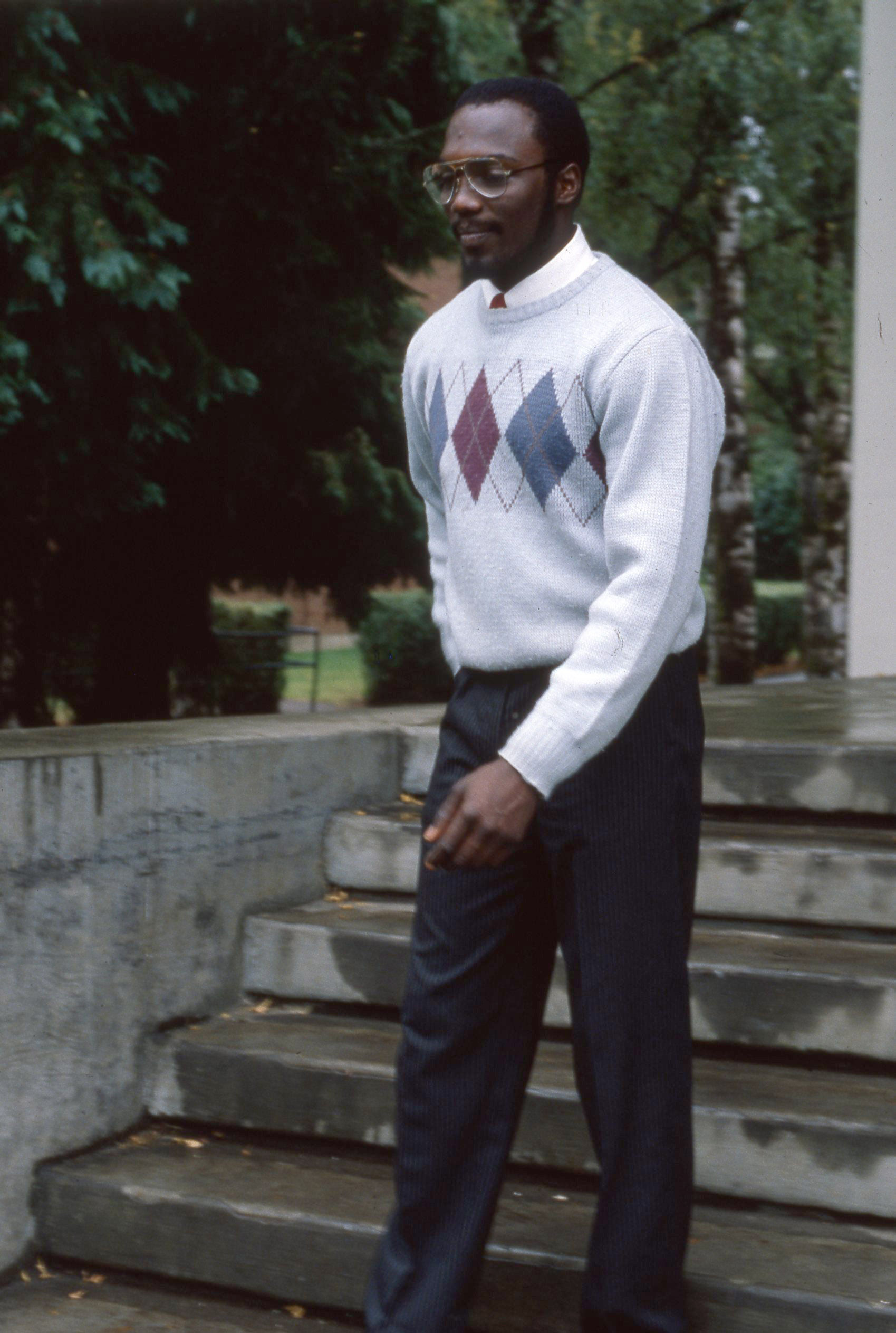 - A man, presumed to be a Pacific University student based on other similar portraits made during the same time period, walking down the steps of Washburne Hall. This photograph was likely taken by a Pacific staff photographer for use in a campus publication, and probably dates from 1983. For a related image, see: PUA_PeoSlides_515