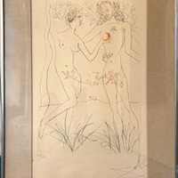 Limited edition color drypoint print by Salvador Dali of "Adam and Eve," from his "Famous Loves" suite. Signed and numbered in pencil: "354/1000, Dali", on BFK Rives paper. The print portrays Adam and Eve in thin, black and brown lines with vegetation rendered in thin, dark green lines, all on a white background. Per an appraisal of this print that accompanied the donation: "It is one of six images that were created as original drypoints on the printing plates by Salvador Dali. The suite of prints was published in 1972 by Fine Art 260." Donated to Pacific University by Judy Schilling.