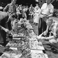 Pacific University students, alumni and faculty getting food from a buffet line during a Luau held outdoors on May 25, 1957. Several attendees wear leis. The food is laid out on trays sitting directly on the ground, with pineapples used as decorations. This lu'au was held on the Saturday afternoon preceding Pacific's 1957 Commencement ceremony, on the lawn by McCormick Hall. The photograph was taken by Herb Drew (Class of 1960). For two other images of the same event, see: PUApic_008558 and PUApic_008559.