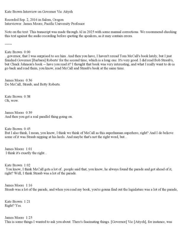 An interview of Oregon Governor Kate Brown on the topic of former Oregon Governor Victor Atiyeh, recorded on September 2, 2016. The interviewer, James Moore, was a professor of political science at Pacific University and was Atiyeh's biographer. The conversation delves into the political careers of various Oregon governors and legislators, focusing on Tom McCall, Bob Straub, and Vic Atiyeh. It highlights Atiyeh's contributions to environmental legislation, including the bottle bill and the DEQ's founding. The discussion also touches on the evolution of public records laws and the importance of bipartisan cooperation in governance. The speakers reflect on the impact of political dynamics, personal relationships, and leadership styles on legislative outcomes. Additionally, they discuss the strategic decisions behind running for state office and the value of executive experience in governance.
