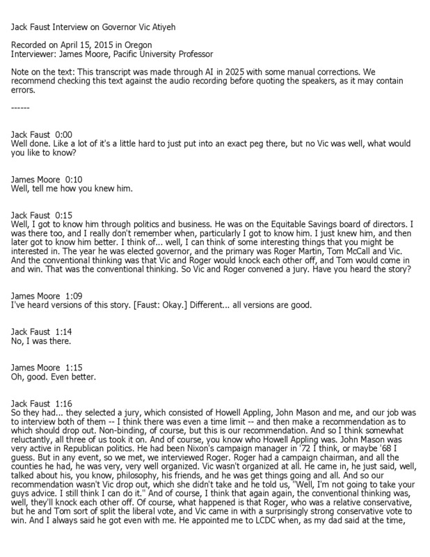An interview of Jack Faust on the topic of Oregon Governor Vic Atiyeh, recorded on April 15, 2015. Faust was an attorney and a well-known public servant, who was active in Governor Atiyeh's and several other Oregon politicians' campaigns. He also served on Oregon's Land Conservation and Development Commission under Atiyeh. The interviewer, James Moore, was as professor of political science at Pacific University and was Atiyeh's biographer.