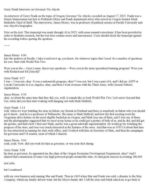 An interview of Gerry Frank on the topic of Oregon Governor Vic Atiyeh, recorded on August 17, 2015. Frank was a former businessman (an heir to Portland's Meier and Frank department store) who served as Oregon Senator Mark Hatfield's Chief of Staff. The interviewer, James Moore, was as professor of political science at Pacific University and was Atiyeh's biographer.