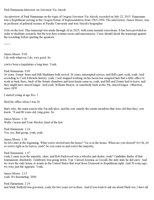 An interview of Paul Hanneman on the topic of Oregon Governor Vic Atiyeh, recorded on July 22, 2015. Hanneman was a Republican serving in the Oregon House of Representatives from 1965-1990. The interviewer, James Moore, was as professor of political science at Pacific University and was Atiyeh's biographer.