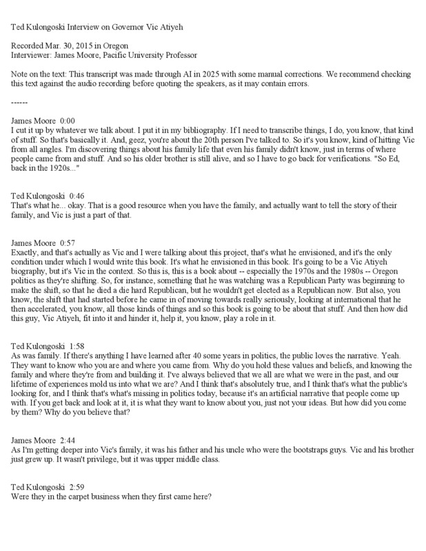 An interview of Oregon Governor Ted Kulongoski on the topic of Oregon Governor Victor Atiyeh, recorded on March 30, 2015. The interviewer, James Moore, was as professor of political science at Pacific University and was Atiyeh's biographer.