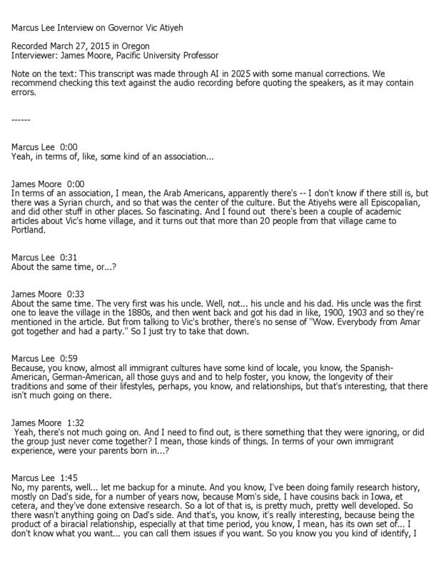 An interview of Marcus Lee on the topic of Oregon Governor Victor Atiyeh, recorded on March 27, 2015. Lee was a member of a prominent Chinese-American family in Portland and was involved in community organizations; his father also knew Atiyeh personally. The interviewer, James Moore, was as professor of political science at Pacific University and was Atiyeh's biographer.