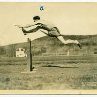 An unidentified member of the track team practicing hurdles.