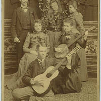 Portrait of unidentified members of the "Ivy Club" in 1891. The instruments and ivy decorations suggest connections to music performance and academics. This may have been a student/faculty musical group on the Pacific University campus, or possibly a community group that included non-university members. There are four women and two men; all are wearing fine clothes with corsages, perhaps indicating that they were dressed for a performance. This group was somewhat unusual for its time, as most social clubs in the area at this time were segregated by sex.