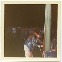 Three Alpha Zeta members tied to a pole and covered in mud while an audience watches in the background.