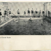 A group of Pacific University students going for a swim at the pool that was in the basement of the old gymnasium.