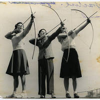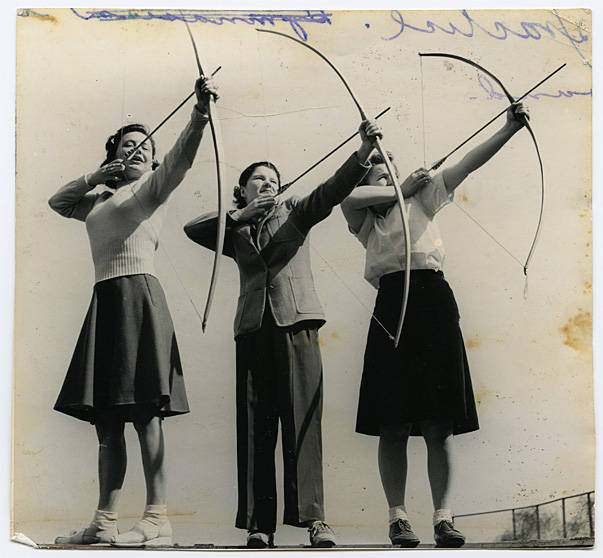 Three unidentified female students draw their bows