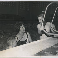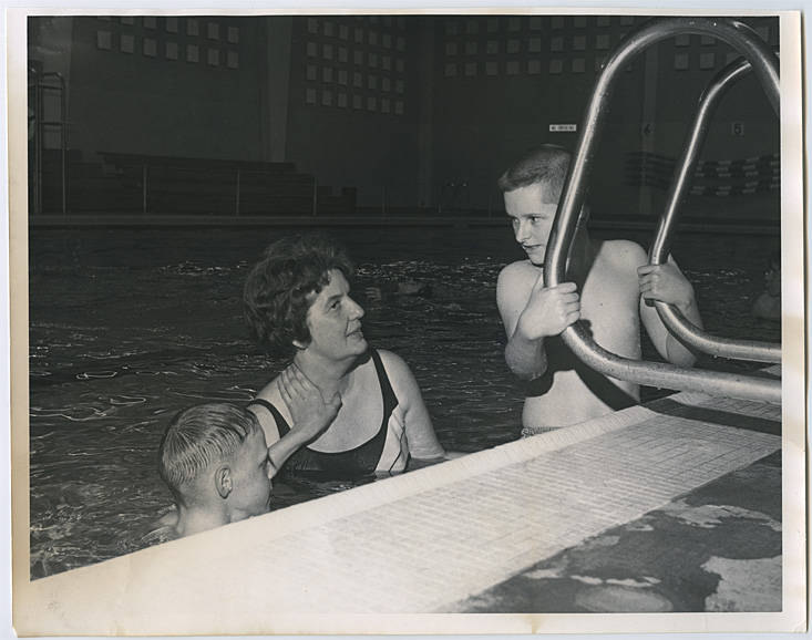 Mrs. Jean Horner and two young boys at the community swimming pool. Mrs. Horner served as Director of Women's Physical Education at Pacific University in the 1950s.
