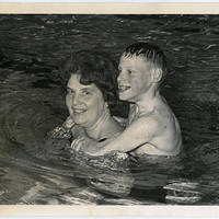 Mrs. Jean Horner carrying a young boy for a piggyback in the pool. Mrs. Horner served as Director of Women's Physical Education at Pacific University in the 1950s.