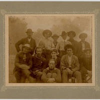 An unidentified group of young men pose for a photo. Most of the men are in moderately nice clothing and one has a small child with him. Originally this photo was found in folder marked Charles Walker Family so there may be some connection.