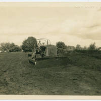 A man sits on a bulldozer in an empty field. The field was a peach orchard that was cleared for a new work-out track in 1938. The field was behind Herrick Hall on the Pacific University campus.