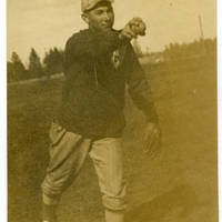 Photo of Leslie Hoar in a baseball uniform, posing as if in mid-pitch.