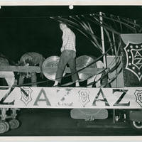 A male student is standing on a Alpha Zeta float in the Noise Parade at Pacific University.