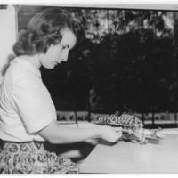 A female students sits in front of a window in Old College Hall on the Pacific University campus. She is examining what looks like an old typewriter that may have been part of an exhibit.