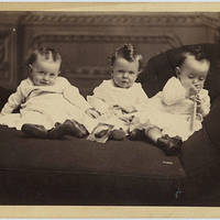 A portrait of three unidentified toddlers. This photo was originally found with material relating to the Walker Family so it is likely there is a connection.